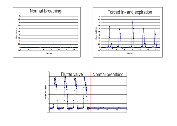 In a trial of 204 patients [8], we demonstrated the efficacy of this novel tool for evaluating air leaks following pulmonary resections. The intent of this project was to develop a safe, reproducible, and clinically applicable system for bed-side use. The device was designed to be connected in-line with the chest tube. In our patients suction drainage systems were used. The degree of suction during the measurements followed a standard protocol for evaluating the device, which included -20 cm H2O, -12 cm H2O, and Heimlich valve on the first postoperative day, and -12 cm H2O and Heimlich valve during the following days. At each suction level the patients were asked to breathe normally, to take deep breaths, to cough, and to breathe out against the resistance of a flutter valve (Figure 4). The leakage per expiration, as well as the leakage per minute, were displayed as standard parameters and recorded on the computer.