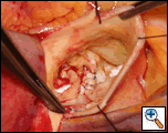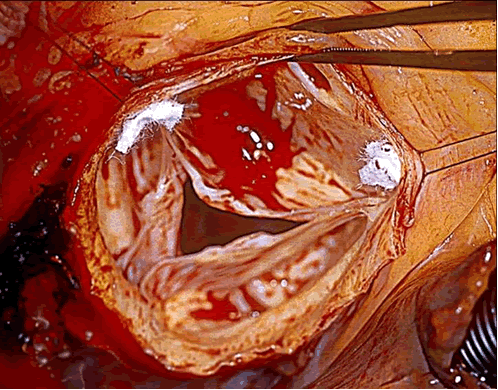 2. The redundant free margin in triangularly resected in the central fused raphe portion. The resection is not continued to the annulus. The apex of the triangle is ended midway to the annulus where the valve cusp tissue remains thickened.
