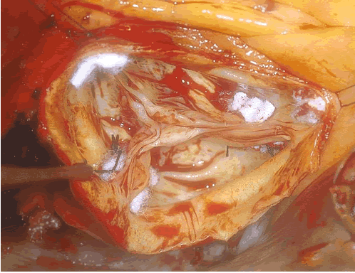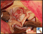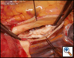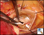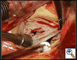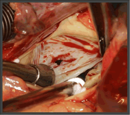 2. An autologous pericardial patch is prepared and used to cover the defect with either running or interrupted 6-0 polypropylene suture. (Figure 4). Avoid the urge to close this defect primarily. This results in retraction of the free margin and loss of coaptation.