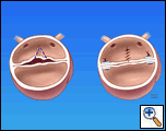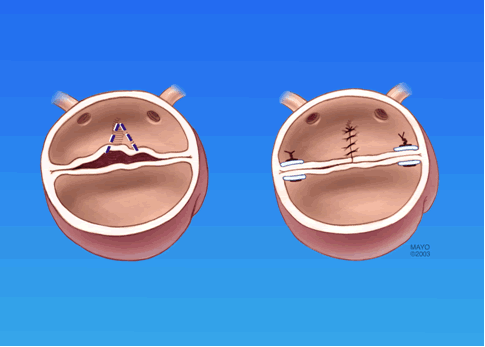 Figure 2a: Illustration demonstrating bicuspid valve with conjoint cusp prolapse and subsequent shortening. Figure 2b: Intraoperative photograph after resection of a central triangle of redundant prolapsing conjoint cusp. The first interrupted suture reapproximating the cut edges of the cusp is being placed. Figure 2c: Intraoperative photograph demonstrating the completed interrupted sutureline. The raphe has been resected.