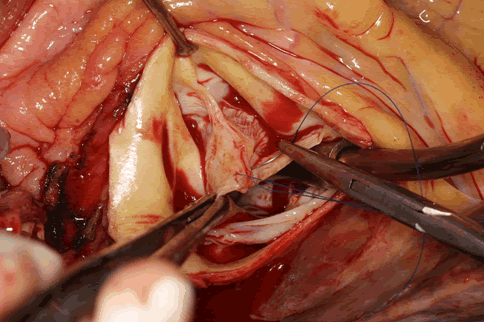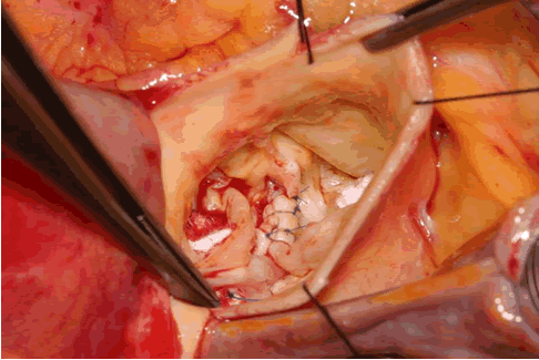 5. Occasionally, the non-conjoint cusp requires slight shortening with a plication suture (6-0 polypropylene suture) to adjust it to the newly repaired conjoint cusp.