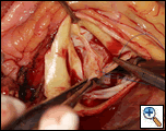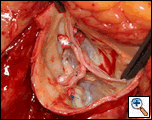 4. Often the raphe is tethered to the aortic wall by a residual commissure. This band of tissue can tether the conjoint cusp away from the center of the aortic orifice. The band should be cut releasing the central portion of the conjoint cusp and deepening the belly of the cusp. The cut to sever the tethering raphe band can be carried into the aortic wall to avoid perforating the thin portion of the cusp where it attaches to the adjacent annulus.