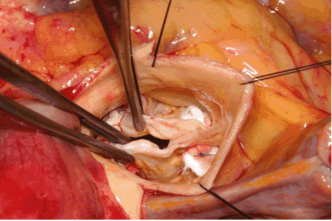2. The prolapsed cusp can be resuspended by performing a limited triangular resection in the center of the cusp with reapproximation of the cut edges of the cusp with interrupted 6-0 polypropylene sutures.