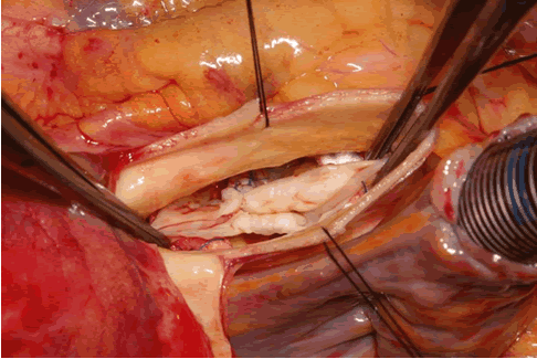 3. After establishing cardiopulmonary bypass, a transverse aortotomy is performed 2 cm above the sinotubular junction. For better visualization, the aorta can be completely transected and suspended with stay sutures positioned above the commissures to better visualize the anatomy.