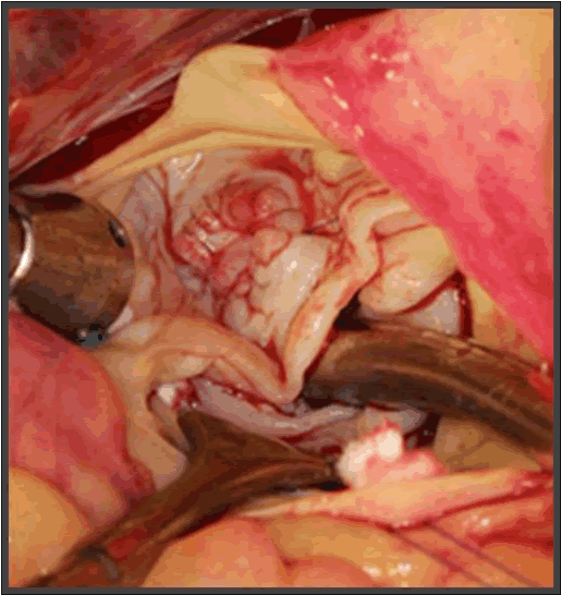 Figure 3: Intraoperative photograph demonstrating completed repair of cusp prolapse in tricuspid valve. Repair was performed by plicating prolapsed cusp and pledgeted commissuroplasty. Note: 6-0 polypropylene plication suture next to the node of Arantis.