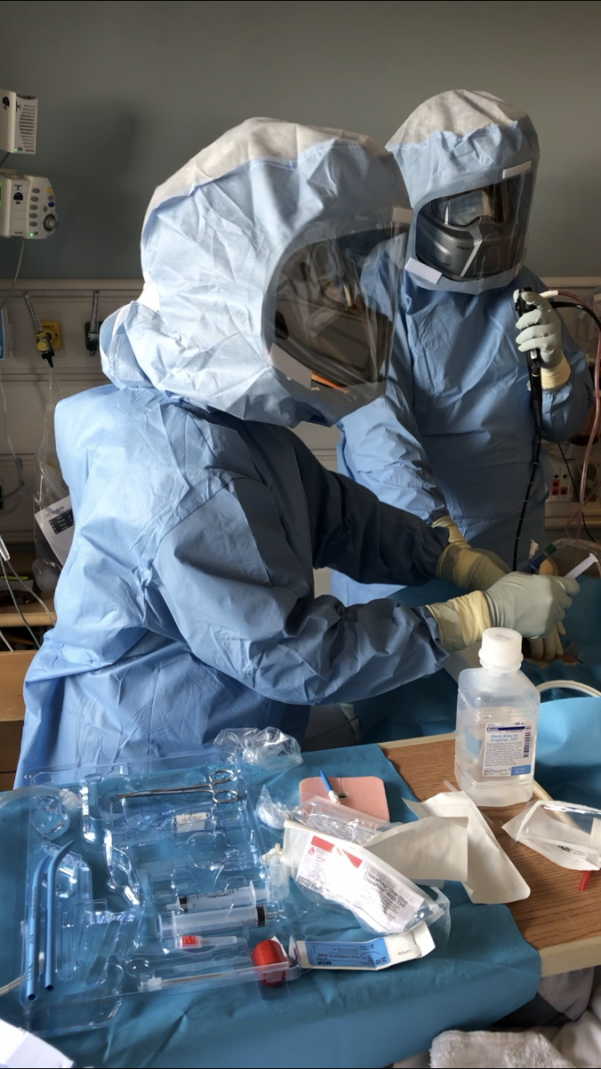 The authors’ protocol for tracheostomy during the COVID-19 pandemic was designed to facilitate patient flow from ICU to dedicated weaning units, and maximize the safety of healthcare workers performing this high-risk airway procedure. While bedside tracheostomy offers the advantage of eliminating viral transmission in the operating room or during transport, the traditional bronchoscopic guided procedure increases the chance of virus aerosolization. While they speculate that the modified side-by-side bronchoscopic technique reduces aerosolization, it by no means eliminates it. Their approach, which maximizes healthcare worker PPE, limits donning and doffing, and minimizes personnel, which has allowed them to perform multiple procedures efficiently in multiple ICU settings, while avoiding high-risk patient transfer and operating room contamination. Institutional safeguards remain paramount to avert nosocomial transmission of COVID-19 during tracheostomy. Until then, the true risks of tracheostomy during the COVID-19 pandemic remains unknown.