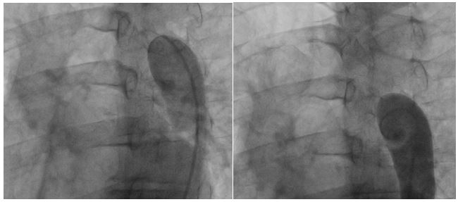 Figure 1A and 1B: Thoracic aortogram. Aortic occlusion is evident.