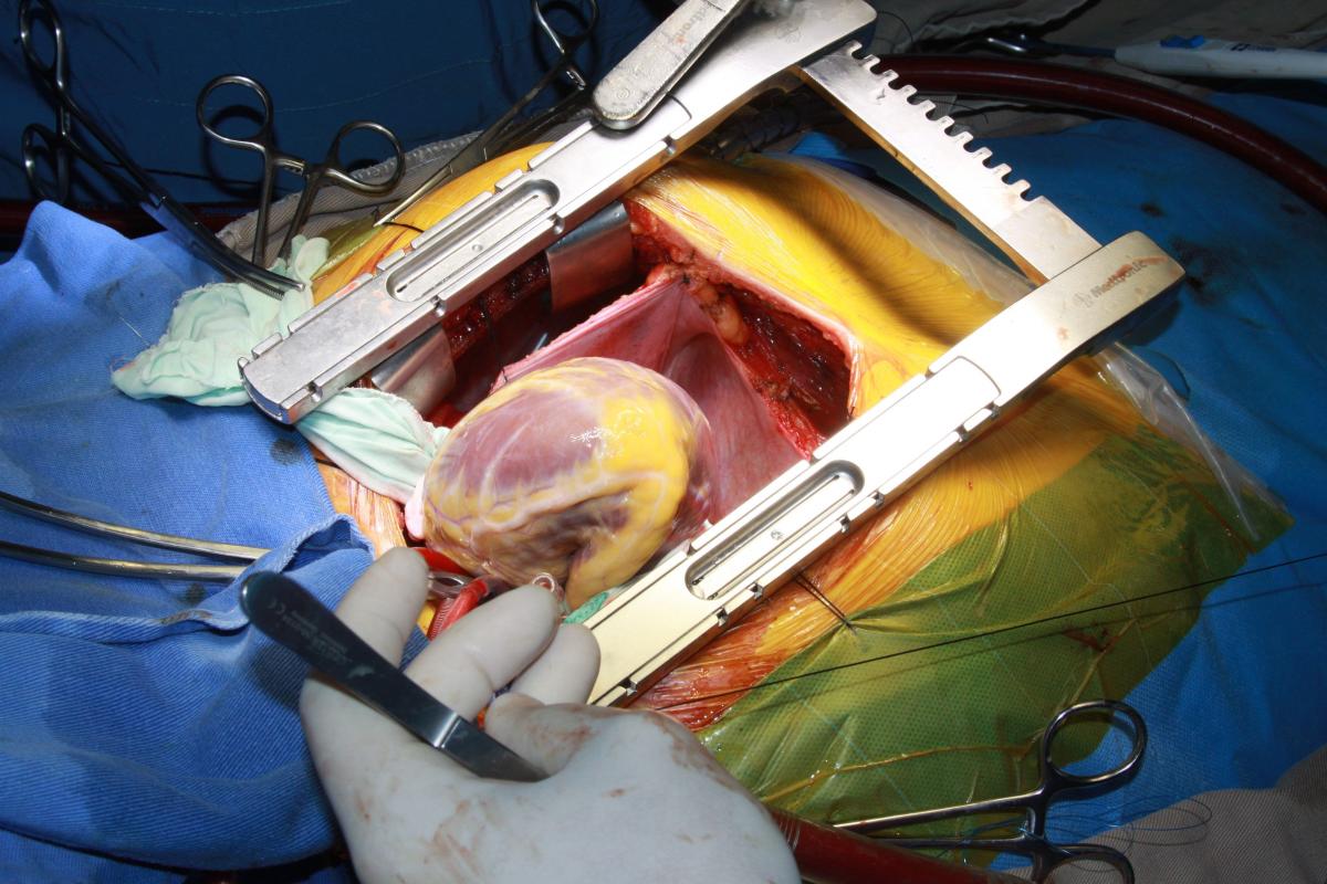 The left internal mammary artery (LIMA) was dissected in a skeletonized fashion. Flow was adequate, although the LIMA was found to have significant atherosclerosis. The aorta was cross-clamped, and antegrade Del Nido cardioplegia was delivered through the aortic root to induce diastolic cardiac arrest. Cardiopulmonary bypass (CPB) was then initiated under moderate hypothermia. Distal saphenous anastomoses of the circumflex artery and right coronary artery were made, and the cardiac apex was then elevated out of the pericardial sac to expose the posterior pericardium (Fig. 3). Care was taken not to injure the esophagus on the right by palpation of a nasogastric tube previously positioned into the esophagus. The pericardium was opened in a longitudinal fashion, exposing the descending thoracic aorta (Fig. 4).