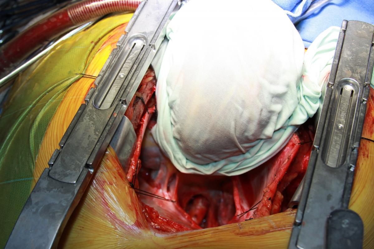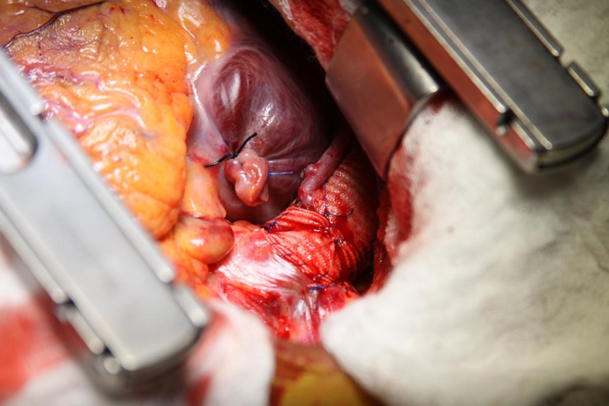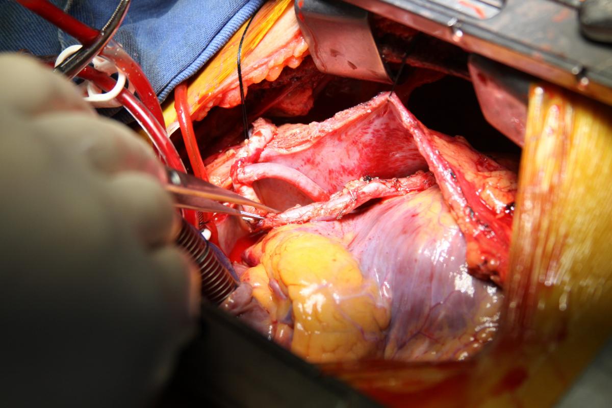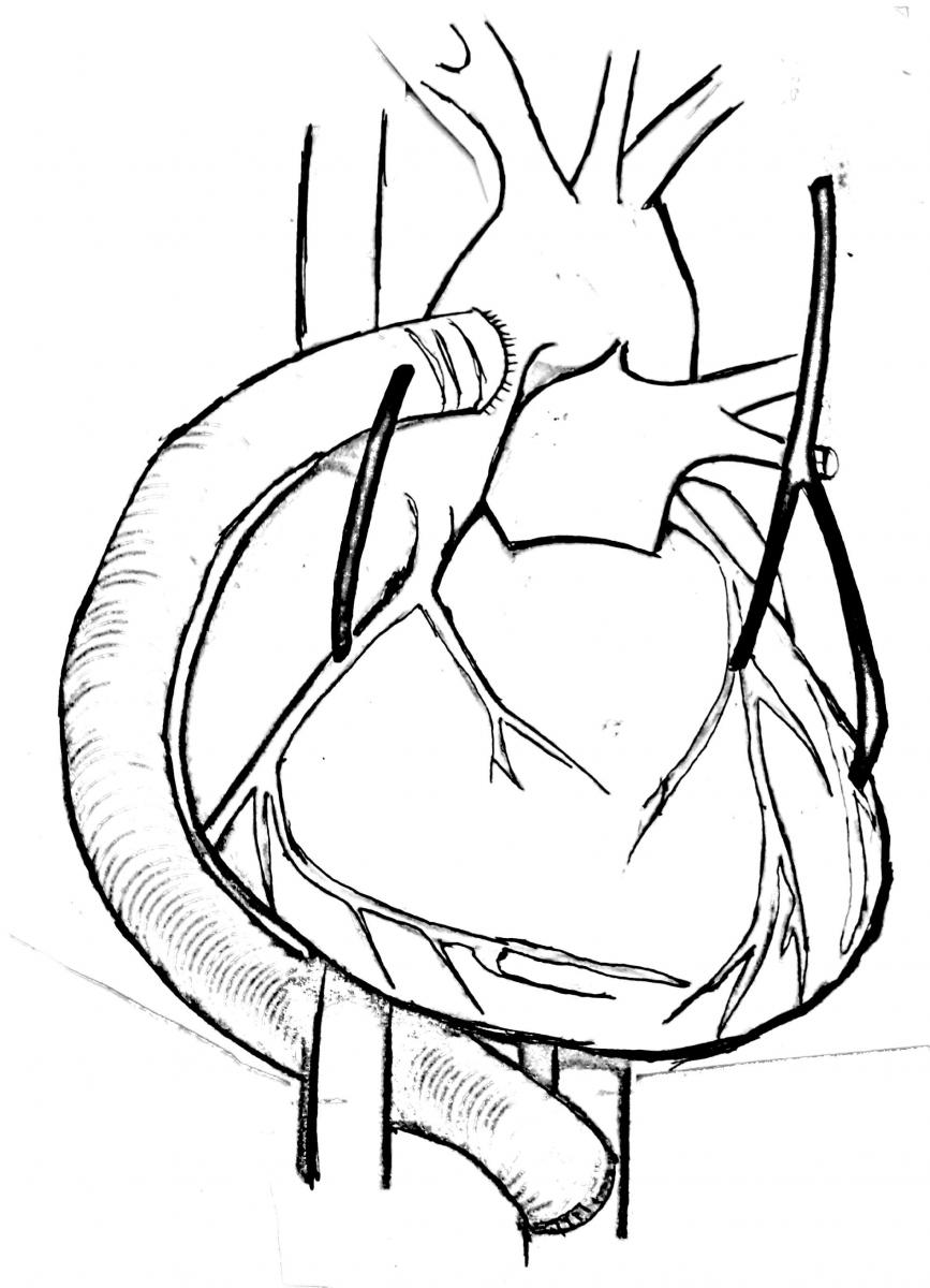 Under proximal and distal cross-clamping, a longitudinal aortotomy was made and a 20 mm diameter Dacron graft was anastomosed end-to-side to the descending thoracic aorta with a running 4-0 polypropylene suture. The diameter of the graft was selected according to the measured descendent aortic size and in accordance with the literature recommendations. The graft was routed behind the inferior vena cava through the oblique sinus, around the right atrium, and above the right pulmonary veins to the right lateral aspect of the ascending aorta (Fig. 5). The proximal portion of the graft was then anastomosed to the ascending aorta, in end-to-side fashion with a running 4-0 polypropylene suture (Fig. 6).