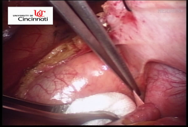 The left chest is then prepped and draped and similar incisions are made, although slightly more posterior (Left Side MiniMAZE). The pericardium is opened posterior to the phrenic nerve, and pericardial stay sutures are placed. After similar mapping of ganglion plexi and PV ECGs, the ligament of Marshall between the left pulmonary artery and the left superior pulmonary vein is divided using cautery (Figure 5 and Video 2). Through a separate port site, the special lighted articulating dissector is placed under the left inferior pulmonary vein and articulated to emerge above the left superior pulmonary vein. The red rubber catheter attached to the dissector is again withdrawn behind the veins. The bipolar radiofrequency clamp is then brought around the left pulmonary veins using the rubber catheter as a guide. The clamp is again positioned on the atrial cuff (Figure 6) and isolation lines are created. Once isolation is complete, PV ECGs are obtained and pacing and high frequency stimulation are repeated to confirm bidirectional block before withdrawing the clamp. Next an Ethicon EZ 45mm thick tissue stapler (green load) (Ethicon Endosurgery, Cincinnati, OH) is introduced through the port. The anvil of the stapler is placed against the left atrium and the left atrial appendage is gently positioned in the jaws (Figure 7). The tip of the stapler usually rests under the left pulmonary artery to include the entire atrial appendage. The stapler is then fired, and the left atrial appendage removed. Bipolar cautery is used to control occasional oozing from the cut atrial edges. A bipolar ventricular pacing wire is then secured inside the pericardium overlying the left ventricle and the pericardium is closed with interrupted sutures. The pacing wire and chest tube are brought out through the port site and the incisions are closed.