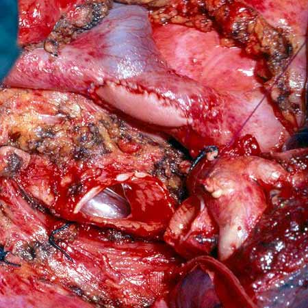- Because the PA is a low pressure vessel, leakage from the suture line may go unnoticed intraoperatively. Also, the bleeding may start in the first or second postoperative day after a patch reconstruction. A blood loss of up to 800ml to 1000ml daily may occur after 1 or 2 days of no drainage. This may last for 1 or 2 days and then stop spontaneously independent of anticoagulant usage. A possible explanation is that the autologous pericardium shrinks and curls markedly after harvesting, and it is difficult to place the suture bites at the appropriate distance. After declamping and distention, bites too wide apart may result. These would not cause bleeding immediately because the PA is stretched downward by the atelectatic lower lobe, and simple apposition of the tissue edges is enough to overcome the low PA pressure. However, in the postoperative period, when the reexpansion of the lower lobe elevates the hilum, the rotation and kinking of the PA may distort the suture line and open a bleeding site. It is therefore very important, especially when using autologous pericardial patches, to carefully check the suture line and test the PA position after reexpansion of the residual lobe. The latter maneuver is also important to prevent thrombosis. After a patch reconstruction of the PA associated with a bronchial sleeve, the bronchial axis is shortened, and the length remains stationary. Some of the discrepancy is compensated by the elasticity of the vessel, but the PA may tend to kink and fold over itself. The aforementioned repositioning of the PA due to the reexpansion of the lower lobe further increases the risk. Impairment of blood flow may ensue, and thrombosis may be facilitated. Under these circumstances, it is better to cut the distorted segment away and proceed to an end-to-end anastomosis.