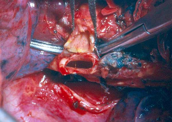 | Figure 5: The right upper lobe bronchus has been preserved for reimplantation. Its short length before (left) and after (right) division is evident. | |