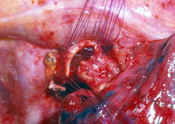 In case of upper lobe reimplantation after “Y” sleeve resection, a few technical points should be considered. The upper lobe bronchus is often so short that it is reduced to a disk of bronchial tissue where the openings of the segmental bronchi can be seen. This is more frequent on the right side (Figure 5). Also, the pulmonary artery and the lung are very close to the suture line and the exposure is poor, especially on the mediastinal side of the anastomosis (Figure 6). The anastomosis is performed in the same fashion as described above (Figure 7).