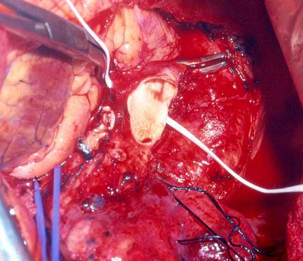 The first case illustrates a right upper lobe sleeve resection. The patient has already had patch reconstruction of the SVC (Figure 2). The azygos vein arch has been resected and the ends are ligated with silk. The right upper lobe has been resected, and a clear distal margin on the bronchus intermedius and proximal margin on the trachea have been obtained. It is important that the suture line is tension-free. This can be achieved by dividing the pulmonary ligament and, more often on the right side, by incising the pericardium around the inferior pulmonary vein.