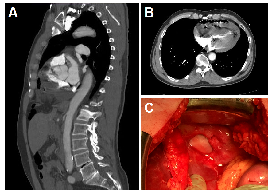 Figure 1. (A) Sagittal CT image showing diaphragmatic defect with small bowl herniated into the pericardium. (B) Axial CT image showing intrapericardial loop of small bowel compressing the chambers of the heart causing cardiac tamponade. (C) Photographic image of the defect in the diaphragm after reduction of intestinal contents.