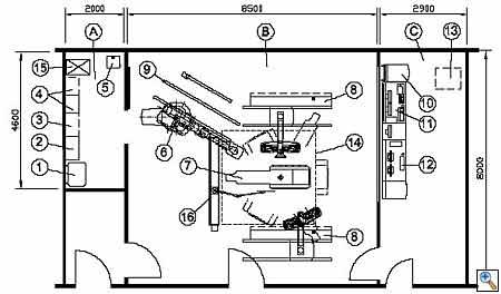 Interventional rooms have excellent imaging capabilities but frequently lack the prerequisites, size, and equipment required for formal operating rooms. Operating rooms meet those required standards, but usually lack high-level imaging capabilities. A hybrid suite should be larger than a standard OR and the basic principle for planning is the larger the better, because not only the imaging equipment needs sufficient space. Staff calculations have shown that in hybrid procedures 8 to 20 people are needed in the team including anesthesiologists, surgeons, nurses, technicians, perfusionists, experts form device companies and so forth (21). Expert opinions recommend for newly built ORs at least 70 m2 (4). Additional space for a control room and a technical room is mandatory adding up with washing and prep rooms to a total of approximately 150 m2 for the whole area. If a fixed C-arm system is considered, an OR size of 45 m2 is the absolute lower limit. Rebuilding in terms of lead shielding (2-3 mm) will be needed. Depending on the system it may be necessary to enforce the ceiling or the floor to hold the weight of the stand (approx. 650 – 1800 kg).