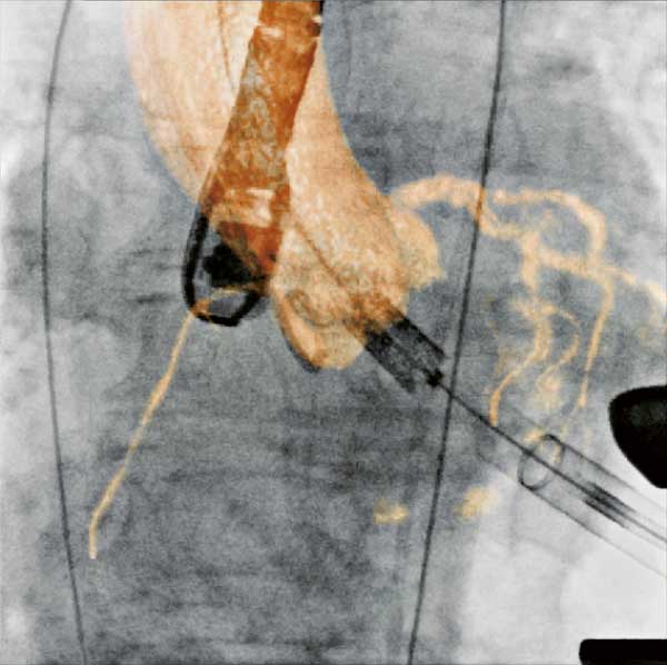 Surgery very much depends on 3D visualization of the anatomy and therefore 3D CT-like imaging with the angiography system is an important feature, because it enables the surgeon to navigate in real time in 3D volumes. In principle, CT-like imaging of the heart is performed by one or two sweeps of up to 220° of the C-arm around the patient. During the rotation several hundred images are acquired and then reconstructed as a 3D volume. If the acquisition is gated by an ECG 3D volumes over time can be generated to depict the beating heart. Radiation dose is comparable to a conventional multi-slice CT. The OR staff can move out of the OR completely during a CT-like run, because it lasts only approximately 10 sec. Reconstruction is performed within one minute. Accurate information of the cardiac anatomy in the operating room supports planning of complex procedures like redo operations, surgery for complex congenital heart disease, transcatheter valve replacement. Segmentation of anatomical structures and overlay of the 3D volumes over live fluoroscopy (3D roadmap) enables the surgeon to virtually navigate in 3D anatomy (Figure 2). First investigations demonstrate the value of this new technology in transcatheter aortic valve replacement (13) (Figure 6), particularly with anatomical adjustable valve prosthesis as the Ventor Embracer valves. In pulmonary valve replacement the 3D valve anatomy in relation to the coronary artery anatomy is of great importance to avoid obstruction. In EVAR (5) endoleaks can be evaluated in the operating room and corrected, if deemed necessary.
