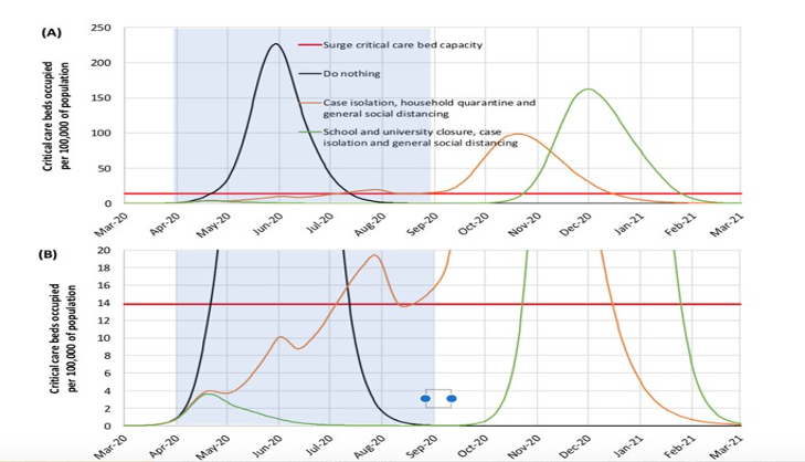 Reprinted with permission by N. Ferguson, Report 9: Impact of non-pharmaceutical interventions (NPIs) to reduce COVID19 mortality and healthcare demand, Imperial College, 2020.