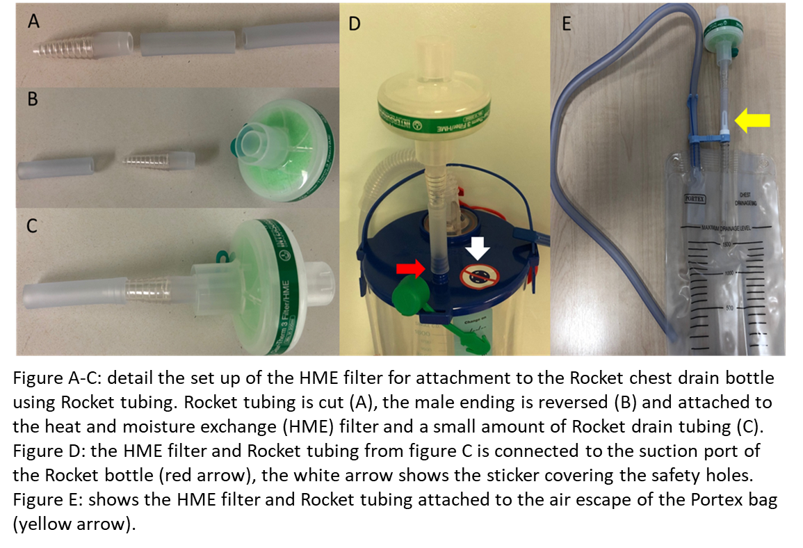 Checking the viral filter must be part of standard nursing checks for all patients with chest drains. The air leak is monitored and any sudden changes in air leak mandate a medical review. The authors have tested the resistance to flow of the HME filter on a ventilator up to a flow rate of 30 L/min, and even at this flow rate resistance is trivial. This has correlated with their clinical experience that the presence of a filter does not impede the air flow out of the chest in patients with air leaks as demonstrated by the chest radiograph showing no pneumothorax. Filters are changed daily as per manufacturer recommendation or sooner if there is any gross contamination. This is done wearing full personal protective equipment (PPE). Additionally, PPE is worn for changing Rocket bottles and for chest drain removal. The same filter system can also be applied to a Portex bag (Figure 1E), which aims to facilitate mobilization on the ward.
