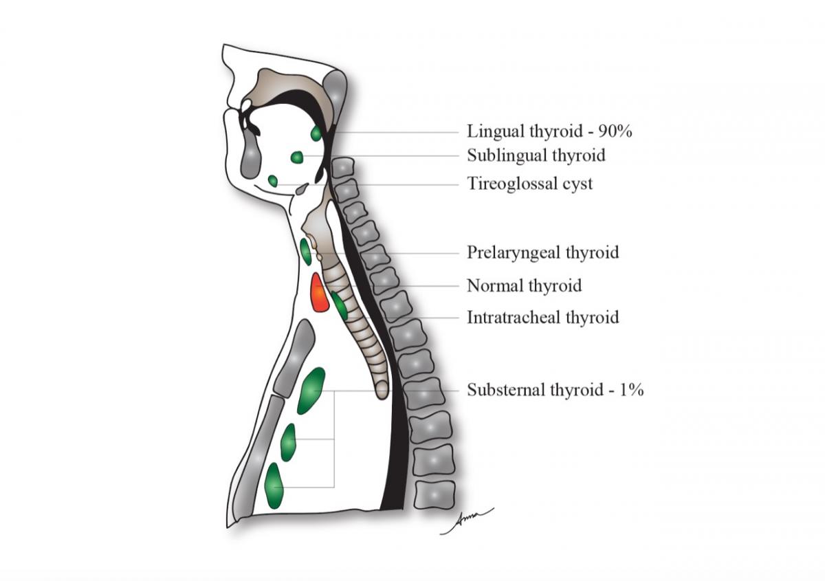 Ectopic thyroid tissue may be found at the walls of a persistent thyroglossal duct or thyroglossal cyst and in the lateral areas of the neck. The embryological development of the thyroid gland is closely related to the embryogenesis of the aortic sac and the heart. When the heart descends into the mediastinum, it can drag the thyroid down, which causes the development of an ectopic thyroid (2).