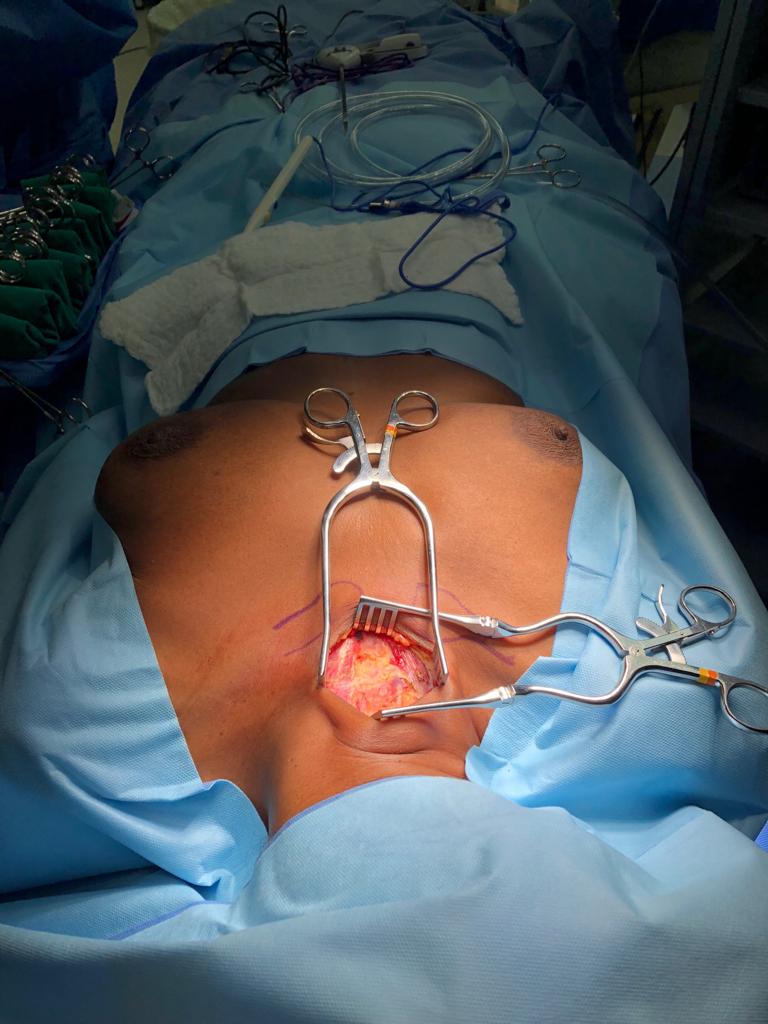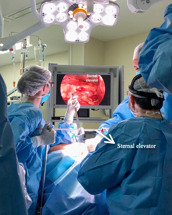 Figure 3. A sternal elevator is used to improve the surgical field at the level of the thoracic inlet. The assistant on the right holds the 30⁰ 10 mm thoracoscope. A 5 mm thoracoscope can also be used.