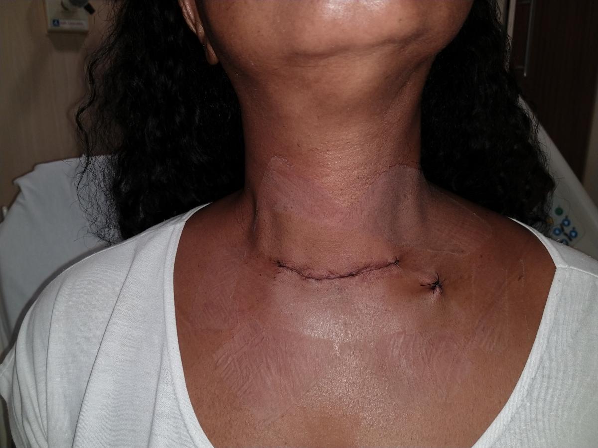 The patient was aware of bearing a nontoxic multinodular goiter and had sought consultation with two head and neck surgeons. Thyroid hormones levels were in the normal range (TSH: 1.29 mcUI/ml, normal range: 0.4-4.3 mcUI/ml; free T4: 1.0 ng/dl, normal range: 0.7-1.9 ng/dl). Thyroid ultrasound with Doppler showed a multinodular goiter with no signs of malignancy. One nodule in the right lobe underwent fine needle aspiration and was benign (Class II, Bethesda). Thyroid surgery was not considered by the two consulting surgeons at that time.