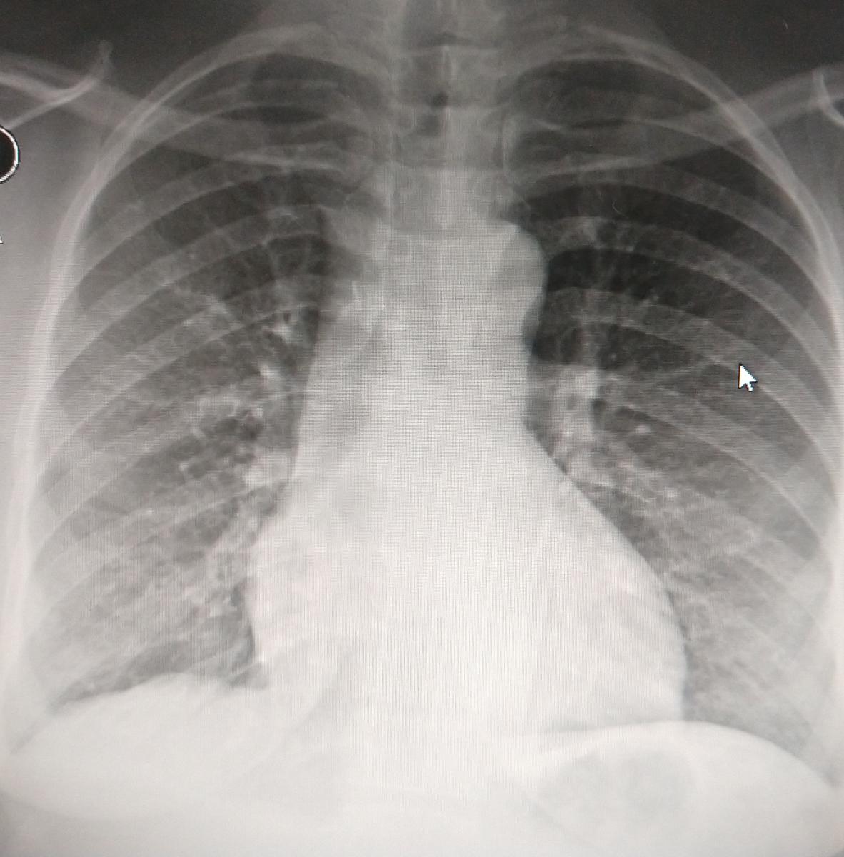 Figure 9. Chest x-ray on the second postoperative day when the patient was discharged. Lungs are fully expanded and no gross abnormality was observed in the operated anterior mediastinum.