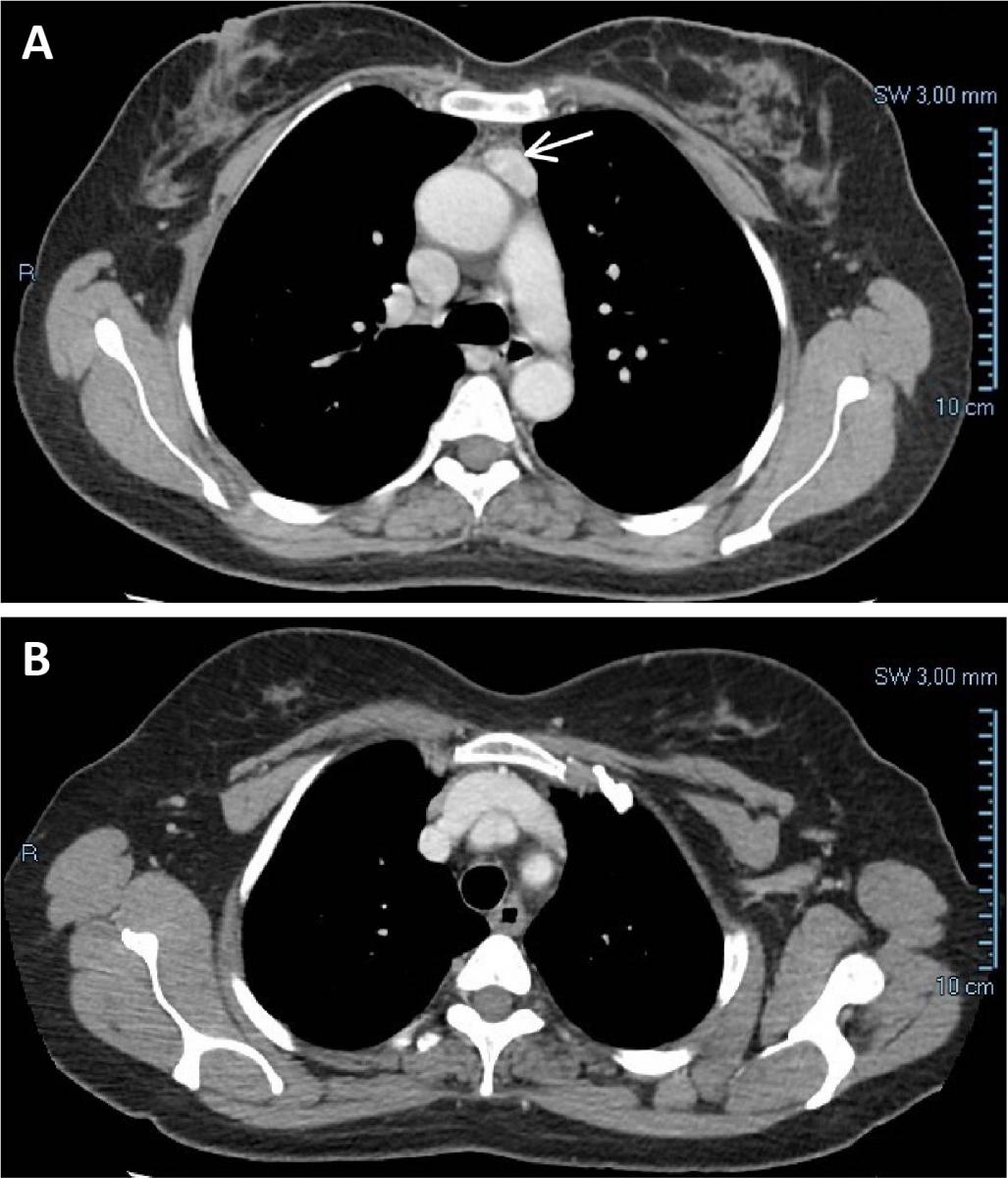 Figure 1. (A) Chest CT showing a tumor measuring 24 x 12 mm in the anterior mediastinum, suggestive of a small thymoma. The tumor showed a high contrast enhancement. There is a clear plane between the mass and the aorta and no compression of any mediastinal structures. (B) No connection with the cervical thyroid was observed. In retrospect, this is one of the features of mediastinal ectopic thyroid.