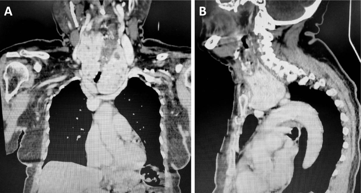 Figure 11. (A) Computed tomography of the neck and thorax (coronal plane) of a patient with a substernal goiter causing dysphagia and compression of aortic arch branches. One can see the enlarged cervical thyroid plunging into the mediastinum, the so called “plunging” or “diving” goiter. This is the most common type of mediastinal thyroid, also called secondary substernal goiter. The vascular supply is in the neck, chiefly from the inferior thyroid arteries. It is different from the mediastinal ectopic thyroid, which has no connection with the cervical gland and possess a distinct vascular supply that comes from intrathoracic vessels. (B) CT of the neck and chest (sagittal plane) of the same patient shown in panel A, with a substernal goiter (“diving goiter”). The enlarged cervical thyroid plunges into the mediastinum, “sitting” on the aortic arch branches. This patient had a history of cerebral vascular accident.