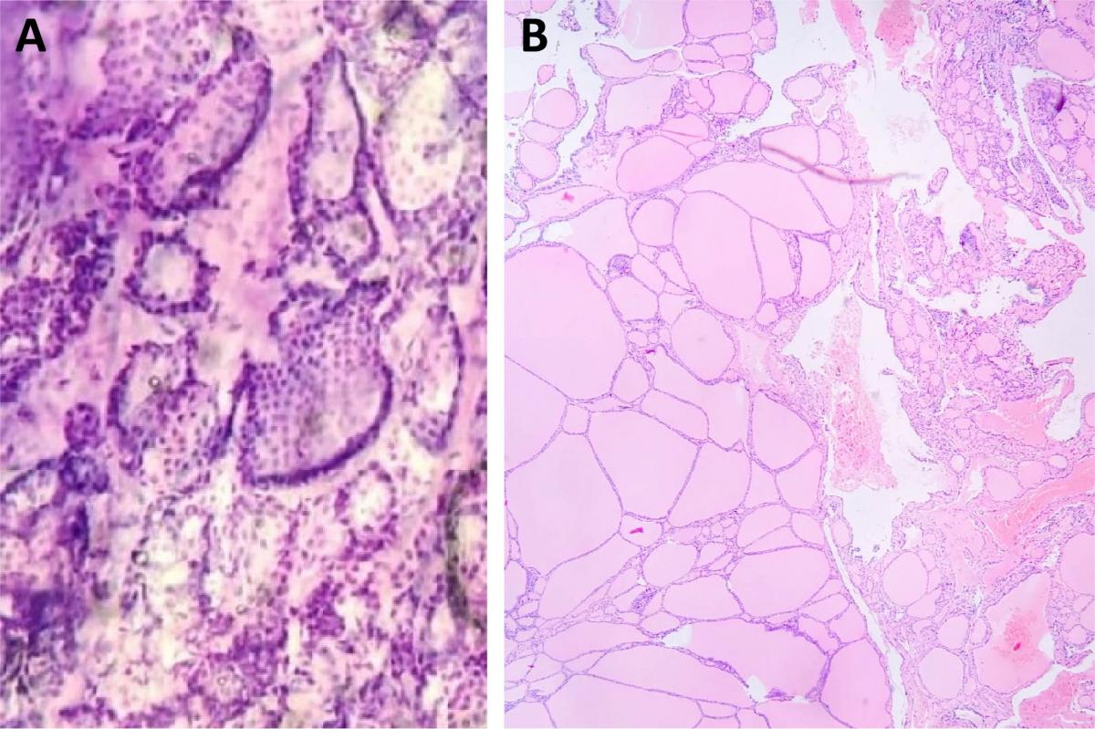 Figure 6. (A) Intraoperative frozen section of the mediastinal mass suggesting ectopic thyroid tissue, as thyroid follicles were observed. (B) Hematoxylin & Eosin stained section showing that the mediastinal mass was an ectopic thyroid. One can observe the normal thyroid follicles with colloid. No malignancy was detected.