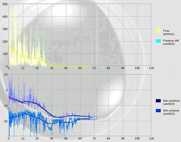 The Digivent is a new pleural drainage system (Figure 2). It has a tear-shaped device called the controller unit. This device represents the “brains” of the Digivent. The size of the air leak in ml/breath is displayed on the controller unit. In addition, the nurse or physician is also able to see the average size of the leak over the past 1 hour, 3 hours or 6 hours. This allows one to assess how the leak is healing and the efficacy of the current chest tube setting. For instance, applying more suction to the chest tube will almost immediately increase the size of the air leak on the controller unit, but sometimes that may improve pleural–pleural apposition and help in the sealing of the air leak. Moreover, the controller unit also measures the maximum and minimal pleural pressures during the respiratory cycle (Figure 3). We have found that, as the two curves start to approach one another, the patient’s air leak is healing. This information affords one the ability to assess the optimal chest tube setting for each patient. The difference suction may have compared to water seal is readily displayed and the optimal amount of suction can be ascertained.