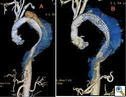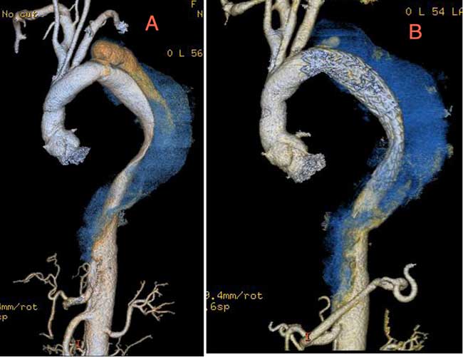 Aneurysms associated with chronic type B aortic dissections are fundamentally a different clinical situation compared to degenerative atherosclerotic aneurysms. [2, 3] Fundamentally, the purpose of treating aneurysms of the descending thoracic aorta associated with chronic type B aortic dissections is to prevent continued degeneration of the false lumen by preventing pressurized blood to communicate with the false lumen. In general, this means landing the distal aspect of the stent graft in dissected aorta which means that a complete 360 degree seal is impossible but thrombosis of the false lumen can still occur. The long-term effects and success of this approach are yet to be determined. We describe the successful treatment and mid-term follow-up of a patient with a 5 cm aneurysm of the descending thoracic aorta associated with a chronic type B aortic dissection with endovascular stent graft.