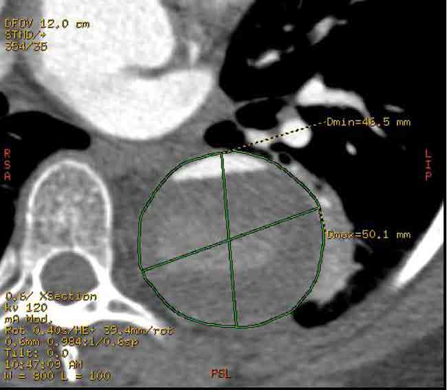 Endovascular repair of patients with chronic Type B aortic dissection with associated aneurysm of the false lumen is a controversial subject. The most significant concern is gaining proximal seal and preventing continued expansion of the aneurysm. This case demonstrates the fundamental principles involved in choosing a stent-graft. The optimal diameter of the stent-graft should be matched to the diameter of the normal aorta proximal to the dissection. Minimal oversizing of the graft is necessary. At most there should be 10% oversizing. This minimizes the chance for graft infolding and for causing damage to the normal aorta from radial force of the stent-graft. The graft is secured by the dissection septum and unlike an aneurysm there is more contact of graft to aortic tissue. There is no need to taper the graft distally and the size of the graft is irrespective of the distal true lumen size. [4,5,6] In summary, the graft diameter should be sized to the proximal normal aorta and that diameter should be carried distally in the stent-graft despite the diameter of the distal true lumen.