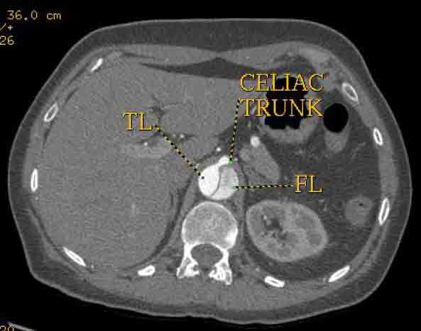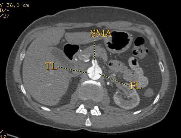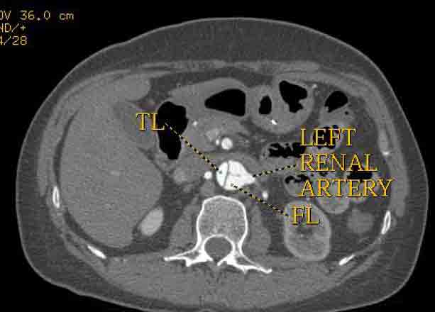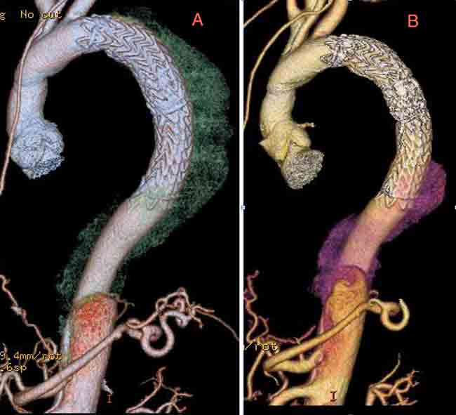 Second, retrograde filling of the false lumen from a distal fenestration in the abdominal aorta is acceptable and should not be considered a failure of the therapy. The purpose of the therapy is to seal all significant fenestrations in the thoracic aorta. Frequently, this is only the proximal entry tear. [7] Sometimes there are no other fenestrations in the thoracic aorta in this scenario no additional coverage of the thoracic aorta is needed other than the proximal stent-graft. When there are other fenestrations, they should be covered. [8] If the true lumen distal to the stent-graft is still significantly compressed, then an additional stent-graft component can be added to the proximal stent-graft. [9]