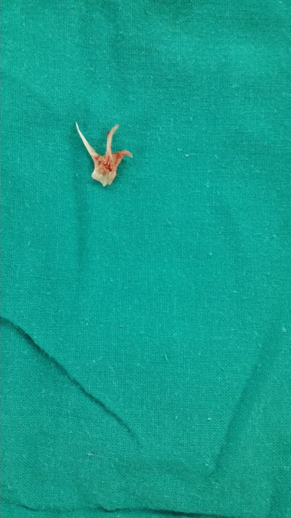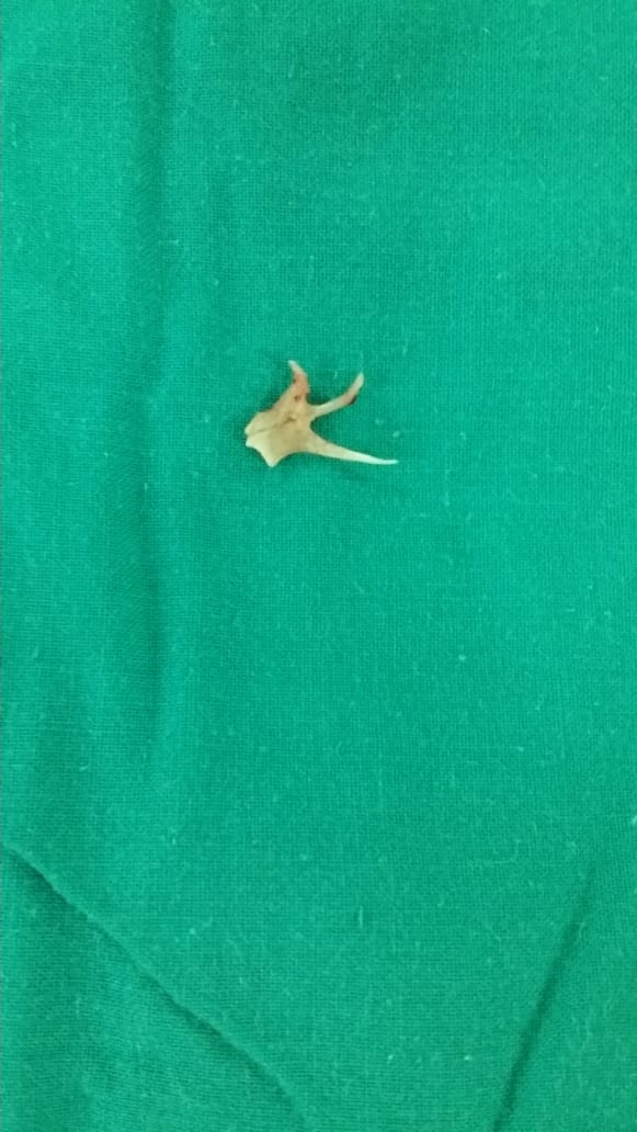 There were signs of respiratory distress (stridor). A plain chest X-ray demonstrated a radio-opaque shadow inside the trachea. A rigid bronchoscope was performed under general anesthesia, and after several attempts, a large fish bone was removed. The foreign body was found under the vocal cords, and the procedure was uneventful. The child was discharged 10 hours after bronchoscopy in a good general condition.