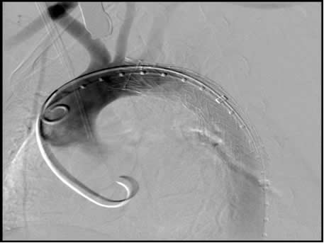 Figure 1: Digital subtraction imaging (DSA) with marker pigtail catheter in distal ascending aorta, guidewire advanced and curled around aortic valve and stent graft deployed covering left subclavian artery.