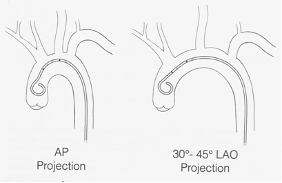 Angulation of the C-Arm is essential for fluoroscopic evaluation of the arterial tree. The basic projections are listed in Table 1. These suggested projections optimize full visualization of the artery and are necessary for correct assessment of angulation, tortuosity, and length measurements. An example of the thoracic aortic arch illustrated at different angulations is demonstrated in Figure 2.