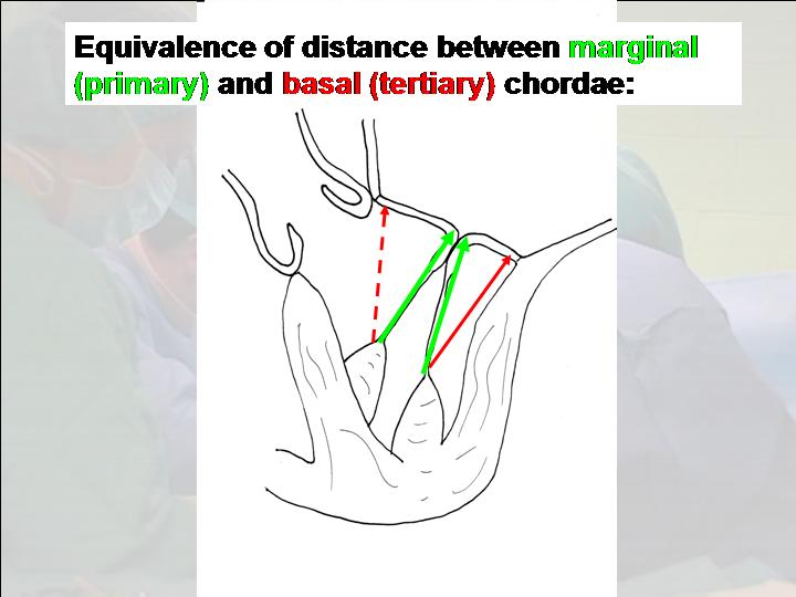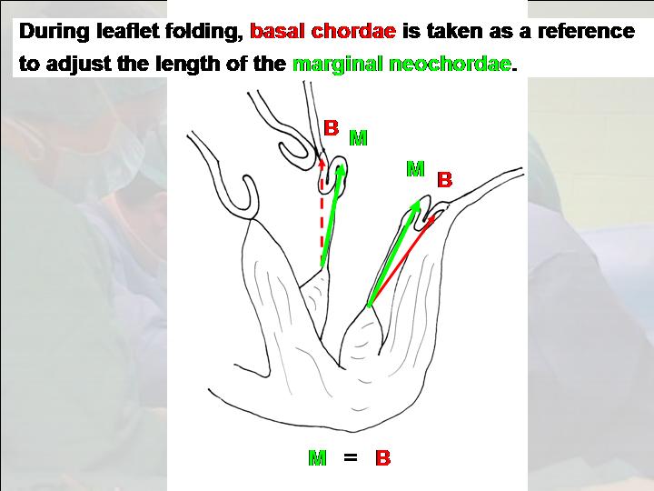 - The principle of basal-marginal chordae equivalence is also considered. The height of a marginal chord is equal to that of the corresponding basal chord (Figure 1, 2, 3). A pliable leaflet can be folded, and its free margin can be temporarily approximated edge-to-edge to the adjacent annulus that is used as the reference point while the neochord is tied. In this position, the length of the neochord will correspond to the height of the basal chord. After unfolding of the leaflet, the neochord will recover its marginal position and the adjusted basal height will turn into the equivalent marginal height. Its final length will exactly match the plane of the annulus at the coaptation point (Figure 7).