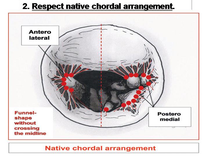 - It is important to avoid passing the chordae across the midline, thereby respecting the anatomical chordae-leaflet pattern. Ideally the anatomical relation between the papillary muscles and the MV leaflets must be maintained. This means preserving the relationship between chordae from the anterior papillary muscle to the lateral half of the anterior and posterior leaflets, and between the posterior papillary muscle and the medial half of the anterior and posterior leaflets. In order to achieve a successful repair, the chordae should not cross these anatomical boundaries. The present technique also reproduces the native chordal arrangement. The correct papillary muscle group and unit are carefully selected to avoid crossing the midline when the neochordae are implanted at the level of the corresponding leaflet.