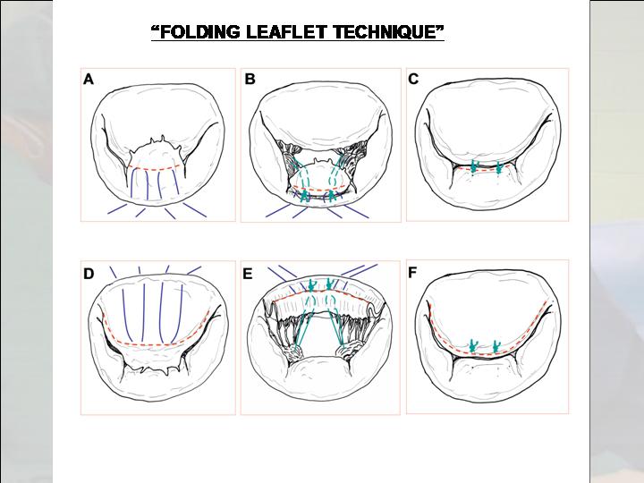 The operative technique for mitral valve (MV) repair utilizing the Folding Leaflet technique is based on the respect rather than resect approach postulated by Perier et al. This technique focuses not only on the creation of a large surface of coaptation, but also on preservation of normal leaflet motion. According to this last objective, transformation of the posterior leaflet into a vertical immobile buttress, as described by Perier, is avoided.