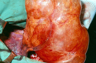| Figure 1: Operative view at thoracotomy of a single bulla with normal underlying lung. | Figure 2: Operative view at thoracotomy of multiple bullae with underlying lung with diffuse emphysema. |