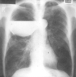 | Figure 3: Chest x-ray of a large bulla with true infection; after the appropriate medical treatment fever, hemptysis and fluid level persisted and the bulla was resected. |