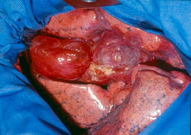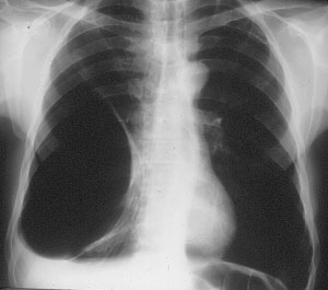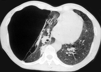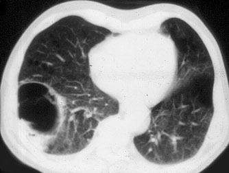 Surgery is generally indicated to modify the functional status of the underlying lung by (1) relieving restrictive changes; (2) increasing compliance and airway caliber; (3) improving V/Q ratio; and (4) decreasing the physiologic dead space. These goals are easy to obtain in patients with enlarging bullae and minimal underlying lung disease. These are the best candidates for surgery and optimal results can be expected. Surgery is also indicated to treat complications related to the bullae, such as pneumothorax, true infection (Figure 3), hemoptysis, cancer (Figures 4, 5), and pain.