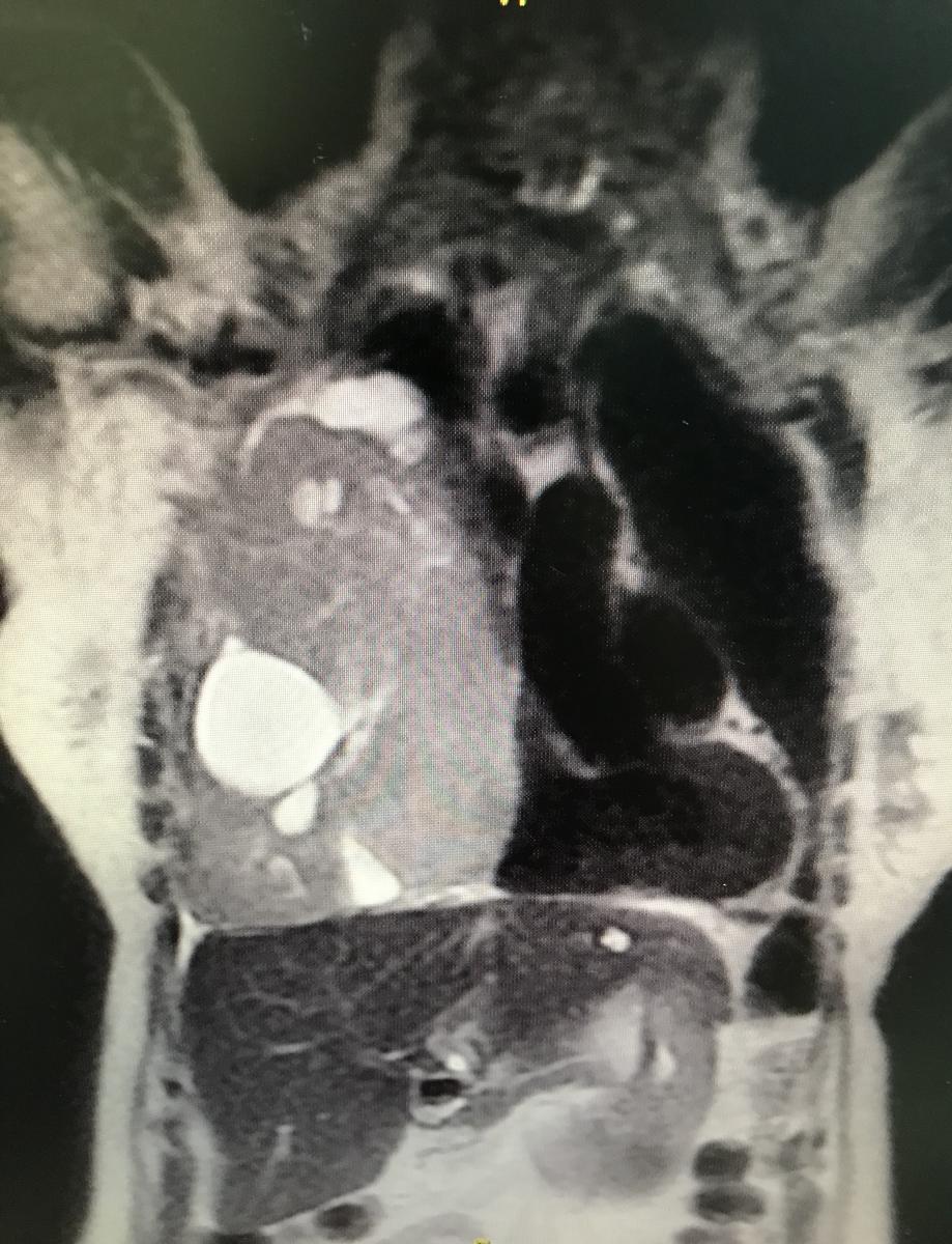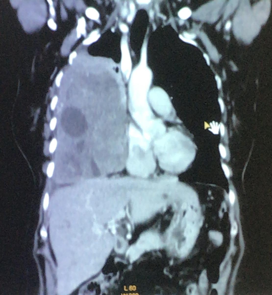 Figure 1. Coronal section of computed tomography, where heterogeneous lesion with cystic area is observed, which displaces the mediastinum, collapses the lung, and flattens the diaphragm.