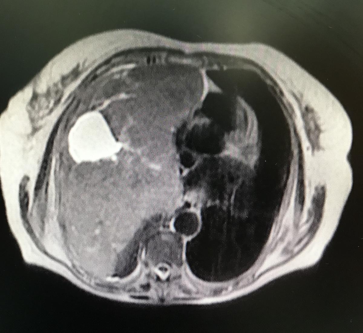 The physical examination showed the abolition of vesicular murmur in the lower, middle, and part of the upper pulmonary field. She brought spirometry with severe restrictive pattern. Thoracic computed tomography (CT) was performed, where a heterogeneous voluminous mass was observed, with cystic areas, in the right lung, 126 x 166 mm in size, in intimate contact with the thoracic wall, diaphragm, and mediastinal structures (figure 1).
