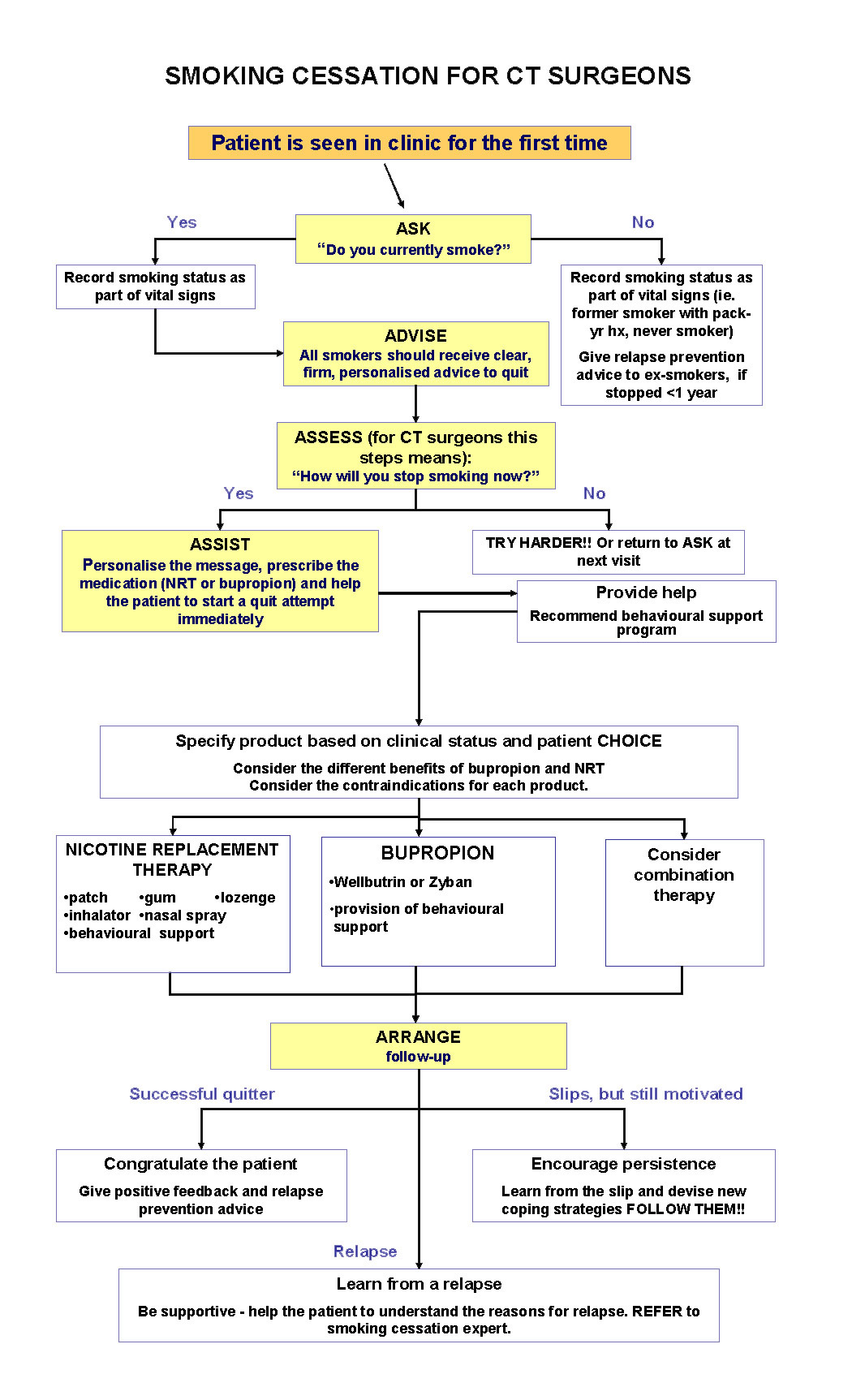 The final step – ARRANGE - includes not only the arrangement of the quitting process, but the follow-up and prevention of relapse steps as well. The patient must be discharged home with smoking cessation follow-up instructions – again, preferably to a smoking cessation clinic or quitline. The smoking status – or 'stopped smoking' status - should be confirmed at each follow-up visit and be part of the follow-up note to the referring physician.