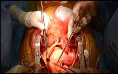 A median sternotomy combined with a upper midline laparotomy was performed to the level of the umbilicus. Exposure of the celiac artery was obtained through the lesser sac. The superior mesenteric artery was exposed through the mobilization of treitz ligament. A heparinization side biting clamp was then positioned and 14 x 7 mm aortobifemoral graft anastomosed to the ascending aorta. Distal anastomoses to the celiac and superior mesenteric arteries were performed in an end to side fashion. The origins of the native vessels were ligated.