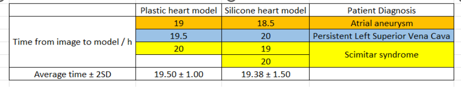 The models supported multidisciplinary preoperative planning and fellows’ training, receiving uniformly positive qualitative feedback from surgeons and cardiac imaging specialists. The per-model material costs and production times are summarized below and benchmark favorably against literature reports, which indicate costs of €80–€120 per model and approximately 15.6 hours from image to model completion (1, 2).