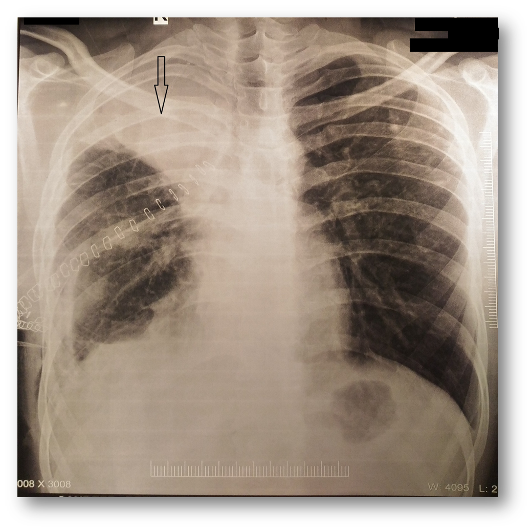 A 21-year-old man in otherwise good health underwent a right upper lobectomy for aspergilloma. The surgery was uneventful. On the third postoperative day, he developed a fever and dull aching pain in his right chest. Plain x-ray revealed an opacity in the right upper zone (Figure 1). Contrast enhanced computed tomography (CT) scan revealed intracavity mass with air bubbles and a long radio-opaque marker, reported by the radiologist as a retained surgical sponge (gossypiboma) (Figure 2).