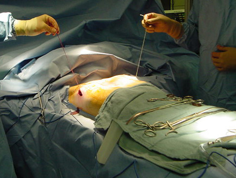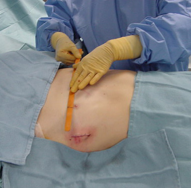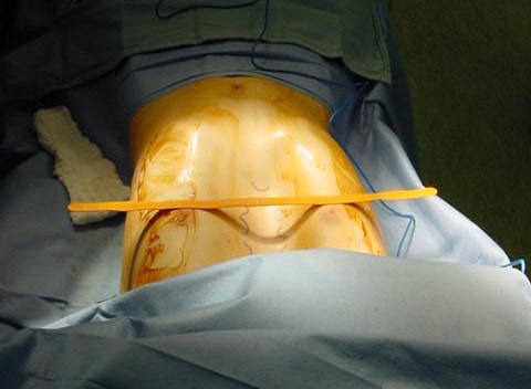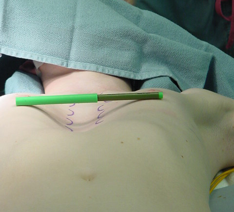 Under general anesthesia, an epidural catheter is placed to aid in perioperative pain control. An endotracheal tube, radial arterial line, and Foley catheter are placed. A sterile marking pen marks the skin at the interspaces of maximal pectus depth on each side of the sternum. The defect usually involves the lower one half to two thirds of the sternum. The deepest point is typically just superior to the junction of the sternal body and the xiphoid process.